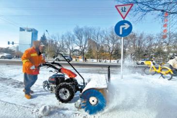 滚刷不断将路面的积雪打散、打碎,并将净雪自动推到一旁,归拢到路侧。“我们班组一共配备了9台抛雪机,比人工用扫帚和雪铲的清扫效率要高得多。”环卫人员解释。
